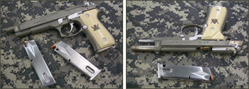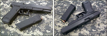 オーストリア製のグロック17のバレルとスライドを延長したモデル。元の17はプラスチックを多用している割には安全性が高く、その上、軽量なので軍や警察などでも使用されている。エダの銃はバレル先端上方に、マズルブレーキ(反動を抑制する)用の穴が開いている。