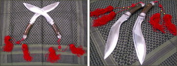 ネパールのグルカ族に伝わる大型ナイフ。ナタのような湾曲した刀身と、その根本の山型の刻みが特徴的。用途は狩猟や農作業と幅広い。グルカナイフとも呼ばれる。シェンホアは常に2本持ち、グリップをヒモで繋ぎ、振り回して遠くの敵を切り倒す。