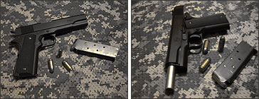 1911年に米軍の制式ピストルとなったコルト社のガバメントを、ブラジルでそっくり真似て生産されたもの。1973年にブラジル軍に採用された。ロアナプラに再上陸を果たしたロベルタはまたもやこのM911を使用。今度はカスタムと思われるドラム型マガジンを装着して、米特殊部隊と渡り合っている。